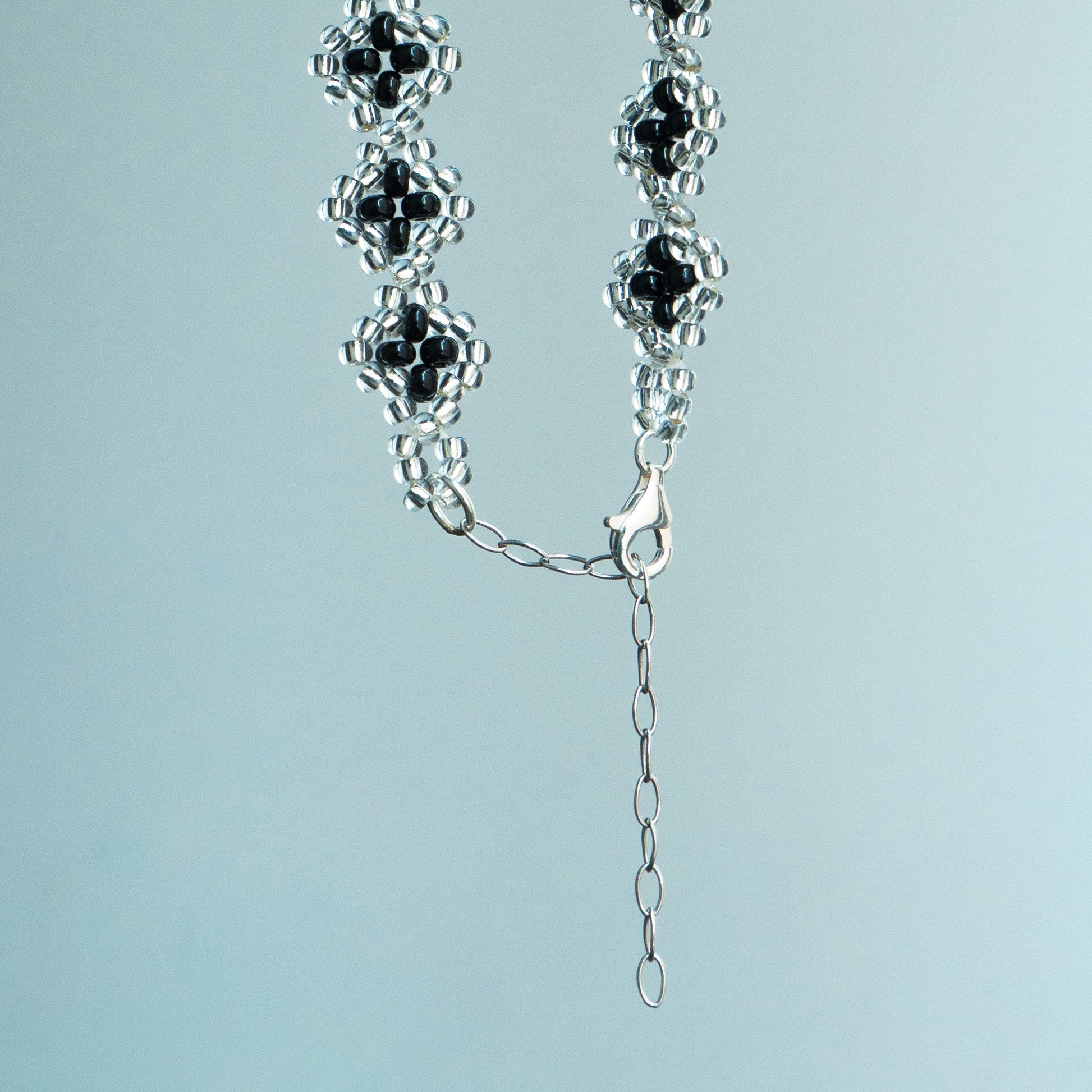 Our jewellery is made with glass beads, Fireline thread, and sterling silver chains and clasps — a little care goes a long way. Avoid water and perfume, and gently polish the silver if it darkens over time.